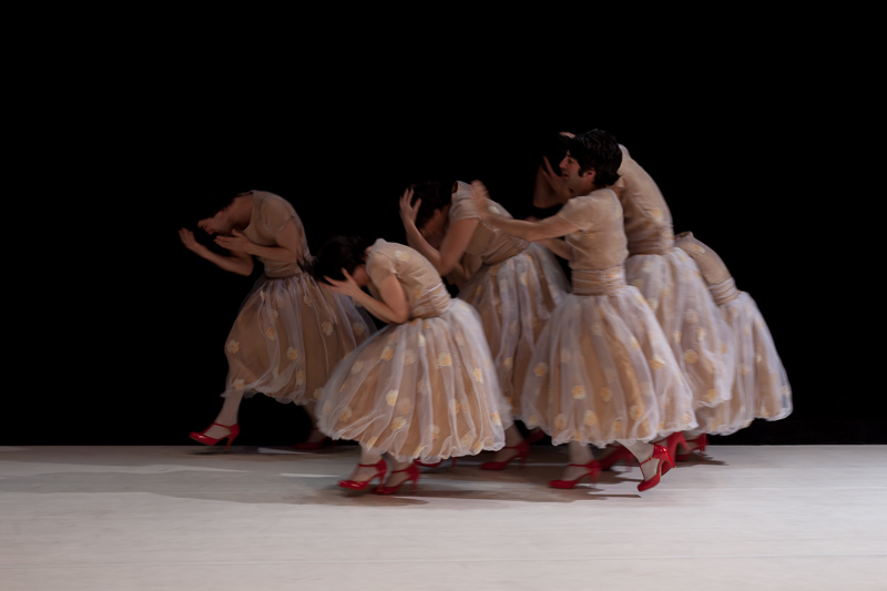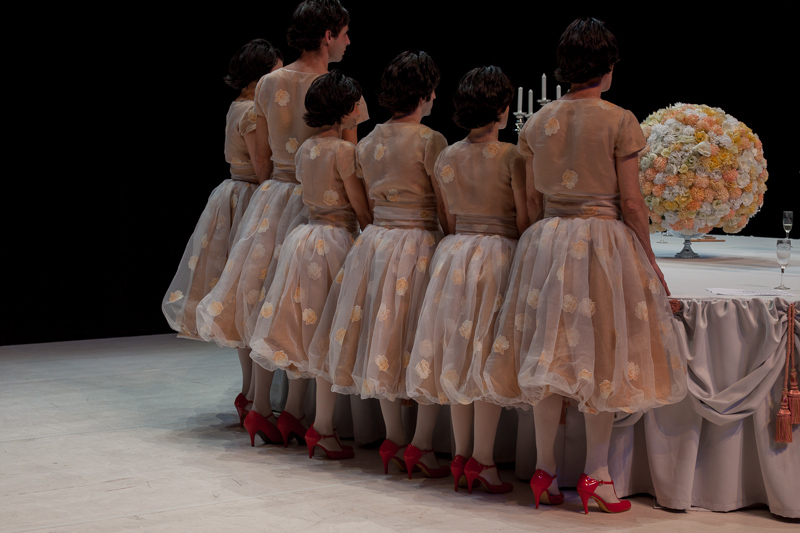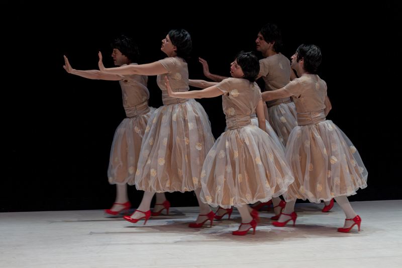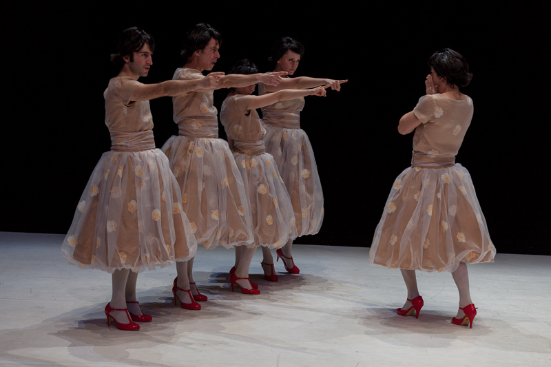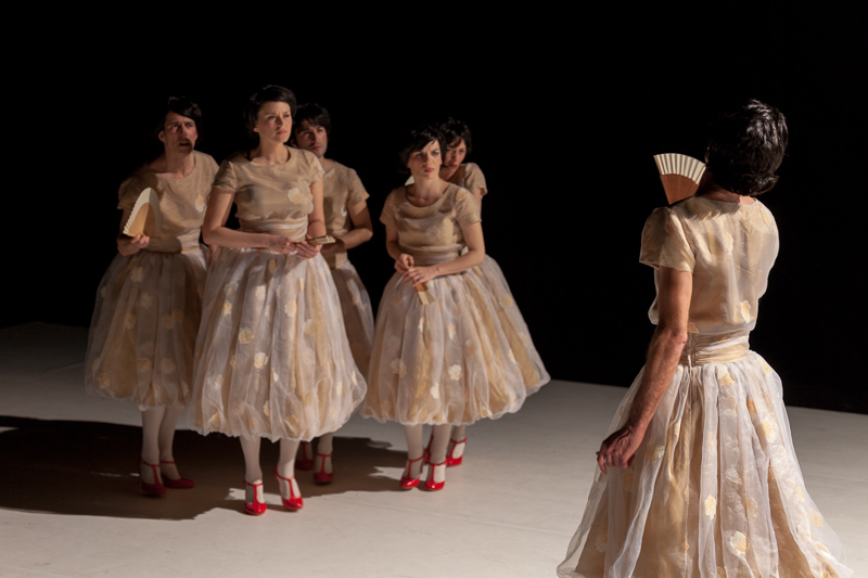 Wilde draws from the universe of Oscar Wilde. And his play Lady Windermere’s Fan – a satire on Victorian moralism. It is an attempt to appropriate a radio version of the play, produced by BBC Radio 7 – an object from the past, itself an appropriation of a play from its past. The performers – all dressed as Lady Windermere – move around illustrating the recording, lip-sync, act over the recording, come together to play some characters, sing in an operetta register, fulfil choreographies. The formal aspects acquire a progressive freedom as the libertarian narrative unfolds.
